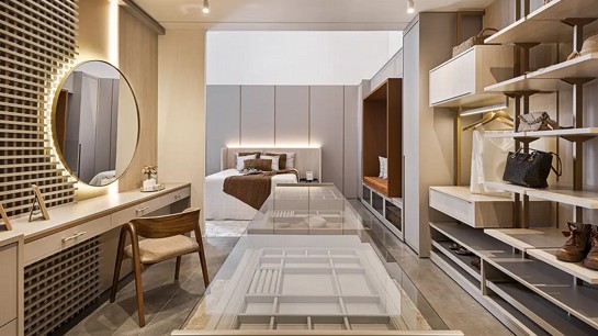 Em closets integrados ao dormitório, a iluminação deve dialogar com o restante do ambiente, evitando contrastes excessivos.